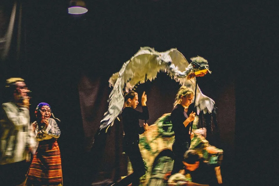 My second trip to Ukraine took me to a rural town in the Carpathian Mountains, working with a youth group there. We spent five days in Ukraine and performed on the fifth. We re-used many of the props, puppets and set pieces from In the Heart of the Woods that was created for Golgol Festival and also some masks and puppets were donated by The Fetch Theatre. I created the giant crane puppet and a girl puppet on sight while the Youth theatre devised the production. The group went on to tour the show to Norway.